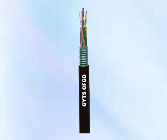 GYTS 光纜的結構是將 250μm 光纖套入高模量材料制成的松套管中,松套管內填充防水化合物。纜芯的中心是一根金屬加強芯,對于某些芯數的光纜來說,金屬加強芯外還需擠上一層聚乙烯(PE)。松套管(和填充繩)圍繞中心加強芯絞合成緊湊和圓形的纜芯,纜芯內的縫隙充以阻水填充物。雙面涂塑鋼帶(PSP)縱包后擠制聚乙烯護套成纜。