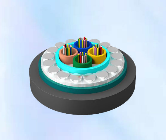 GYSXTS 光纜結構是多根單模光纖或多模光纖由高模量的樹脂材料經 UV 光固化成為相對位置固定的束狀光纖結構,再將多根光纖束套入的松套管中,套管內填充防水化合物。松套管外加阻水材料以保證光纜的縱向滲水,鋼絲繞包成纜后雙面鍍鉻涂塑鋼帶(PSP)縱包, 再在外擠制聚乙烯護套。